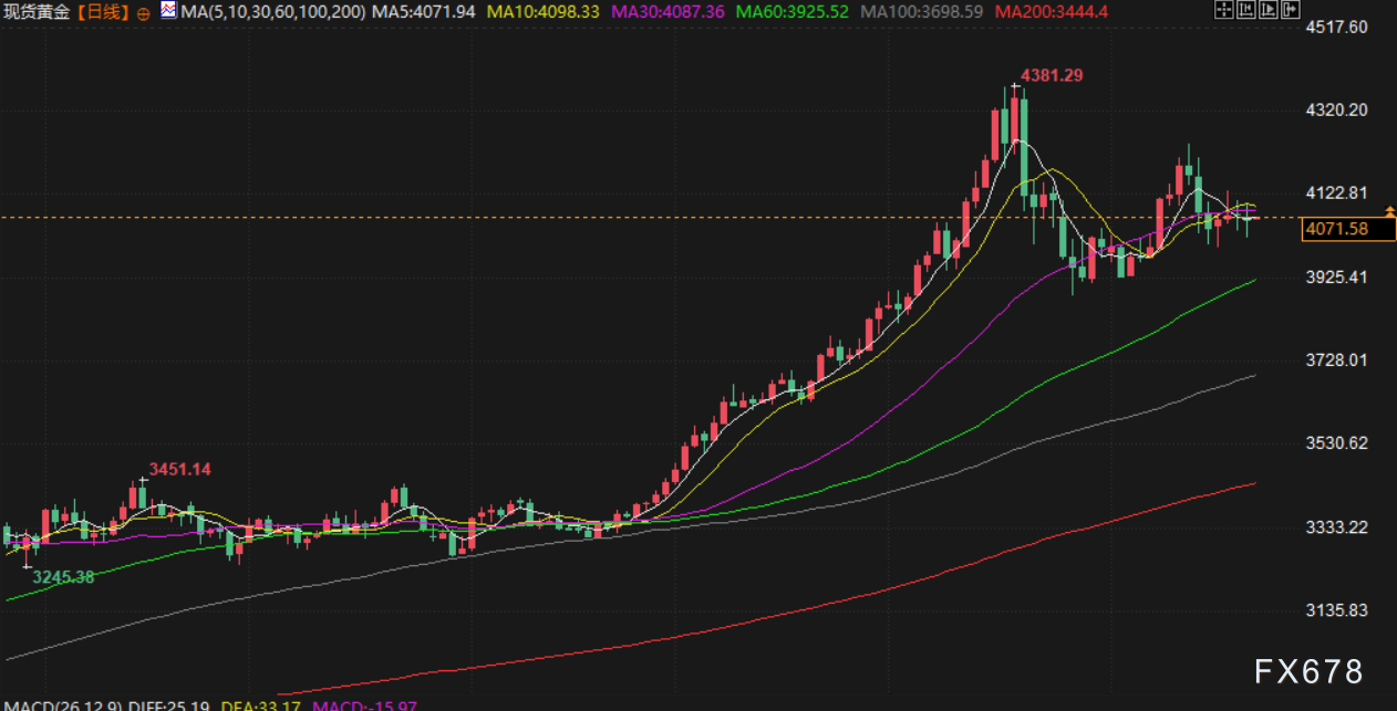 汇通财经APP讯——周一(北京时间11月24日)亚市早盘,现货黄金交投于4070.90美元/盎司附近,金价上周五在震