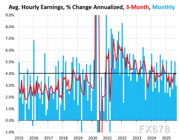 9月平均时薪较8月上涨0.25%(年化涨幅3.0%)。三个月平均时薪年化涨幅为4.0%,略有加速。自4月以来,这一三个月平均值呈现波动走势。